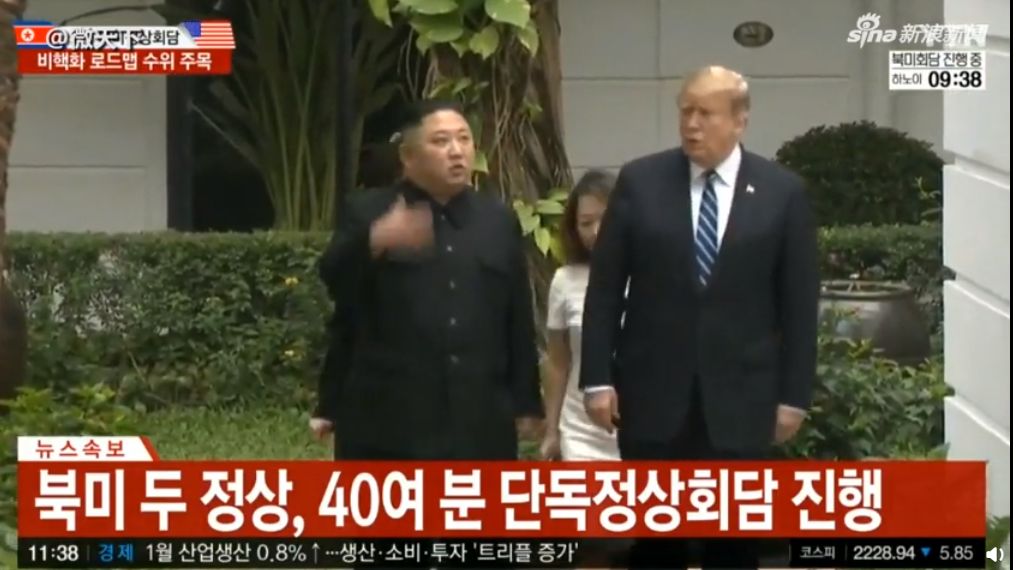 今天上午,特朗普与金正恩的一对一会谈似乎还很愉快,媒体拍到了两人结束一对一会谈后,结伴在酒店花园散步的镜头,画面很和谐。