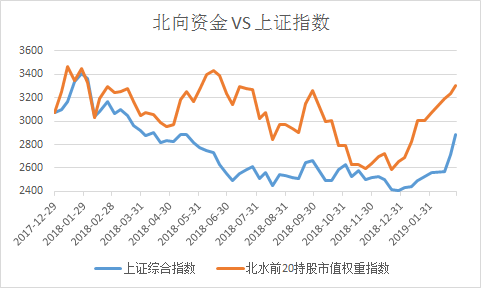 北向资金持有的这些股票看上去确实不错,那么实际表现如何呢?我们整理了北向资金持有市值前20的股票,根据它们的市值占大盘比为权重,做了一个“北水前20持股市值权重指数”。为了方便与上证指数比较,北水持股指数起点同2017年12月29日的上证指数,后续走势反映了北水持股指数的涨幅。