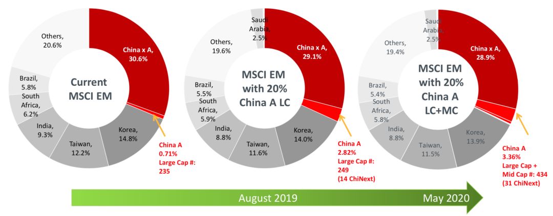 这个月MSCI先决定第一个内容,扩大A股在MSCI比例中的纳入因子。MSCI这波操作之后,A股在MSCI新兴市场指数的权重将提升至2.8%,有望给A股带来3000亿元以上的资金量。