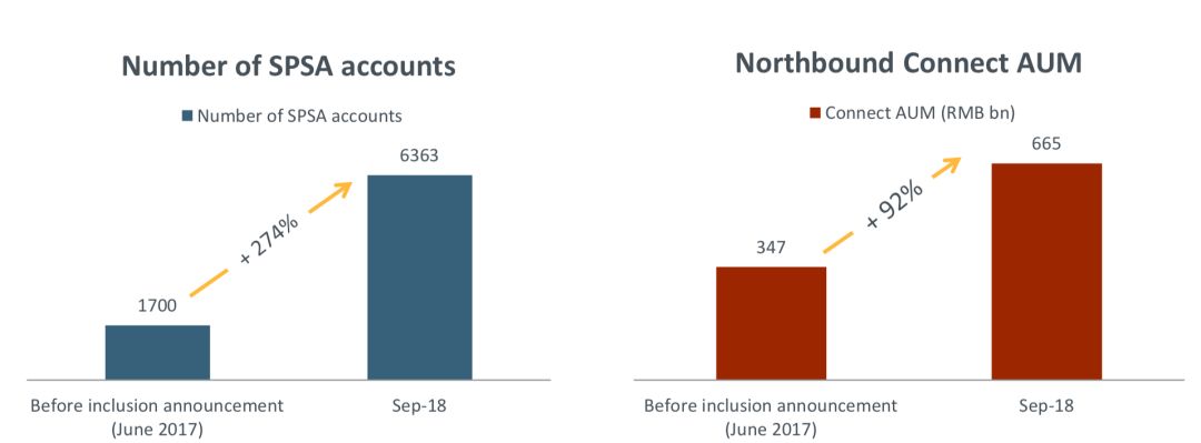 2017年MSCI纳入A股之前,外资在港交所用于购买A股的特别独立账户数(SPSA)仅1700个,去年纳入后账户数提升274%至6363,同时北向资金的持股规模更达到6650亿元。