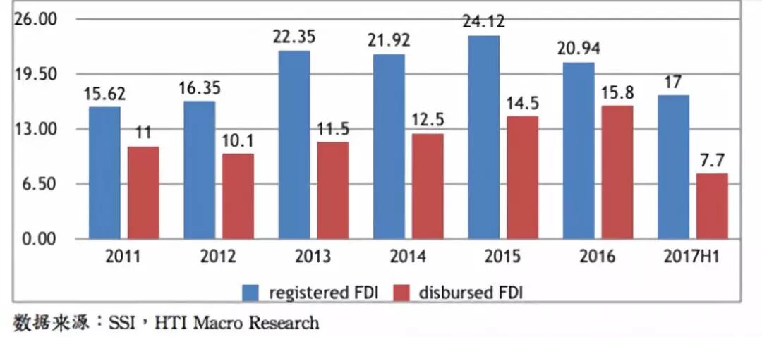 ▲2011年-2017年H1越南外商直接投资(FDI)走势图,近年来,大量外商投资进入越南,相当一部分流入房地产市场