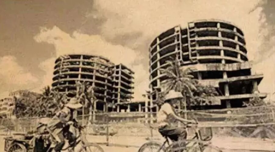 ▲二十五年前,靠着“拍楼花”炒起来的海南房地产一夜崩盘,房价遭到腰斩,图为上世纪90年代海南的烂尾楼