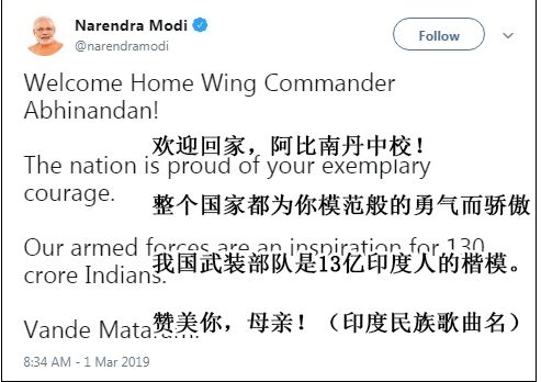 巴基斯坦昨天释放了印度战俘,巴总理伊姆兰·汗称,“两个拥有大规模杀伤性武器的国家不应走向战争道路”,而巴方为缓和局势所做的努力不应被视为软弱;印度外长斯瓦拉杰则在各党派全体会议上表示,印度并不希望军事冲突升级。