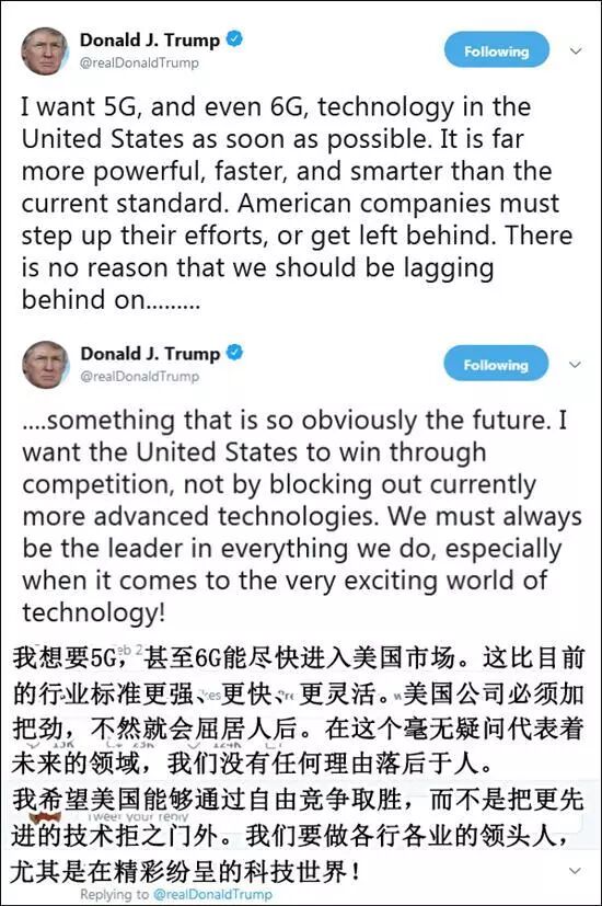 2月21日,美国也松口了,特朗普在社交网站发文称,“我们希望美国能通过自由竞争取胜,而不是把先进的技术拒之门外。”