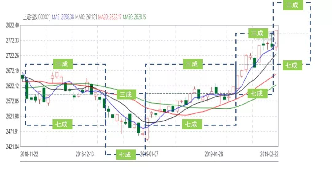 以我今年的操作为例,1月份前后,箱体底和顶分别在2500-2700,中枢是2600点,对应是7成、3成和5成仓位。大盘缓缓下跌,我也是慢慢加仓,因为没有急跌,所以最低点2440点时,我的仓位最终定格在7成。