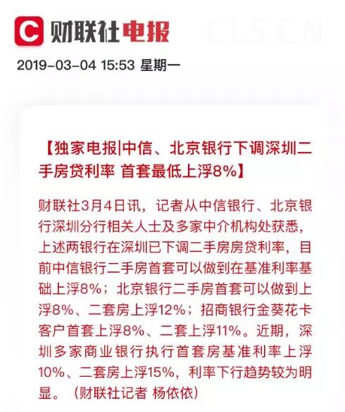 另外,据“上海报业集团”旗下的“财联社”报道,中信银行、北京银行下调了深圳首套房贷款利率上浮的幅度,最低只用上浮8%。二套房的最低上浮幅度,也下降到了12%左右。