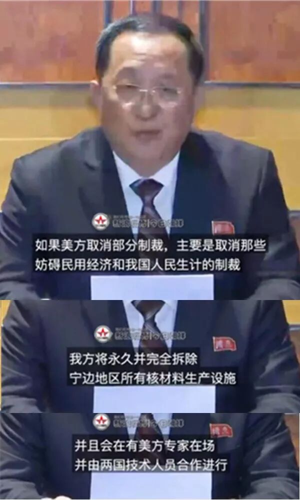 3月1日凌晨,在首脑会谈无果而终后,朝鲜突然召开发布会,给出了与美方不同的说法。按照朝鲜外务相李勇浩表示,朝鲜方面并没有向特朗普说得那样强调必须解除全部制裁,而是提出取消部分制裁,即要求取消2016-2017联合国涉朝制裁11项决议中涉及朝鲜民生的5项。