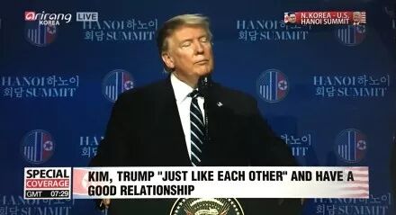 特朗普在记者招待会上说,和朝鲜没达成正式协议是因为美国要求朝鲜全面弃核,而朝鲜要求美国马上取消经济制裁。弄僵了...