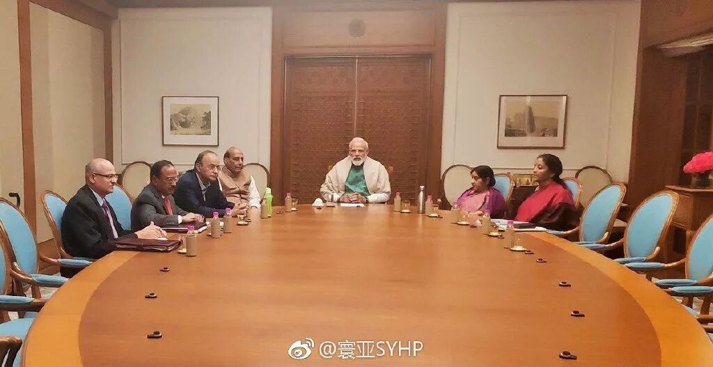 另外,@寰亚SYHP 微博上还发了一张图,图中莫迪在主持印度国家安全会议,结果一看这个国家安全会议包括莫迪一共7个人,这样子怎么看怎么像村委会的办公会。