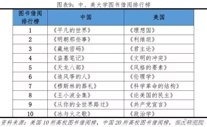 中国大学生借阅前三名是《平凡的世界》、《明朝那些事》、《藏地密码》,而美国大学生借阅前三名是《理想国》、《利维坦》、《君主论》;从思想的深度而言,美国大学生借阅的图书明显要比中国大学生高一个层次。这就是精英教育与平民教育的区别。