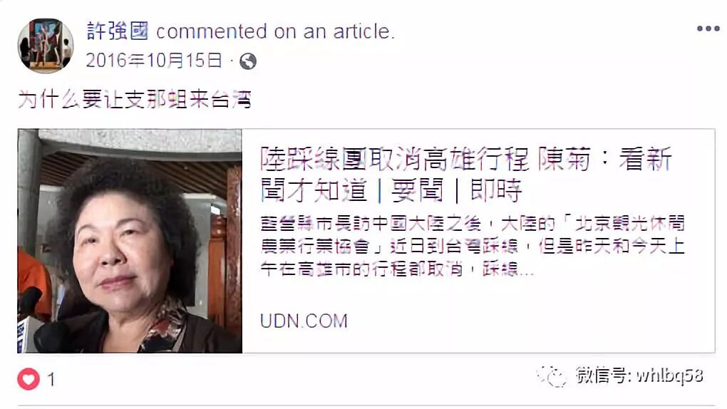 2016年10月15日,许强国对大陆采购团取消高雄之行在其脸书发表言论:“为什么要让支那蛆来台湾”。