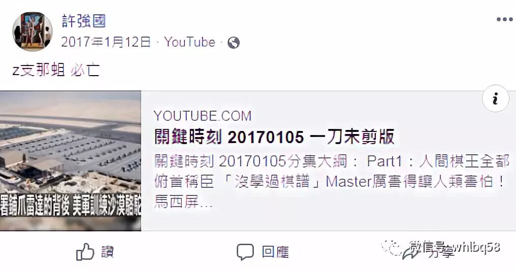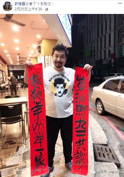 2017年1月12日,许强国在脸书狂言“支那蛆必亡”。他还发表了许多攻击大陆的“民运”分子视频,笔者就不在列举了。