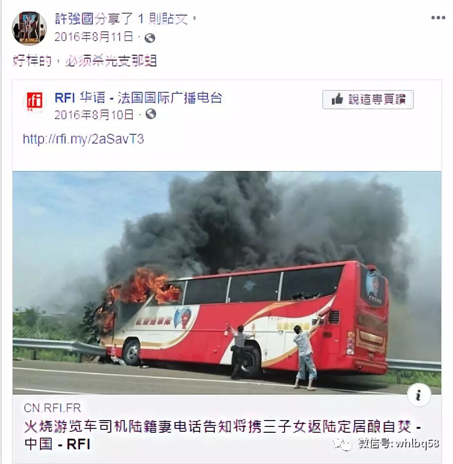 2016年7月19日大陆游客在台湾旅游时,被台湾司机人为纵火致使大陆24人被烧死。对于这样的惨剧,当时的蔡英文及其民进党当局表现出极其冷漠的态度引发两岸民众的愤怒。许强国在8月11日脸书上却这样表示“好样的,必须杀光支那蛆”。