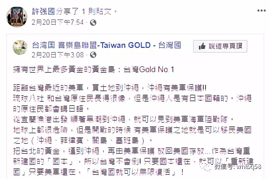 今年2月20日,许强国全文转发“台独”组织“喜乐岛联盟”的“台独”文章。