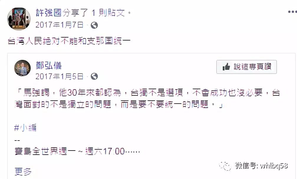 2017年1月7日,许强国对同样是“台独”媒体人郑弘仪的报道留言写道“台湾人民绝对不能和支那国统一。”