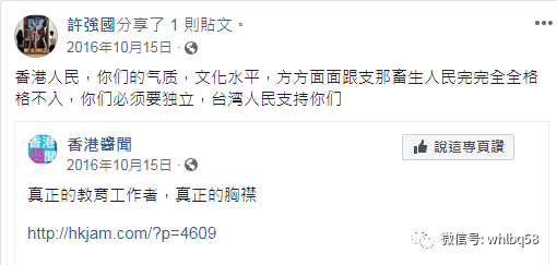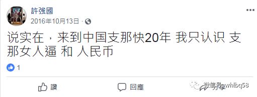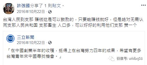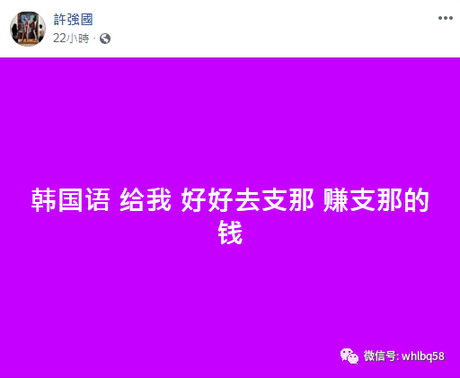 昨天(5日),许强国在脸书上对于韩国瑜认同“九二共识”、提倡与大陆进行经贸往来的观点,写道:“韩国语(韩国瑜),给我好好去支那,赚支那的钱”。这不仅是对韩国瑜的讥讽,更是对大陆惠台政策的恶毒诋毁。
