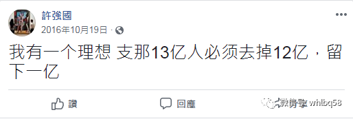 2016年10月19日,许强国在脸书上还发表了他的理想:“我有一个理想,支那13亿人必须去掉12亿,留下一亿”。