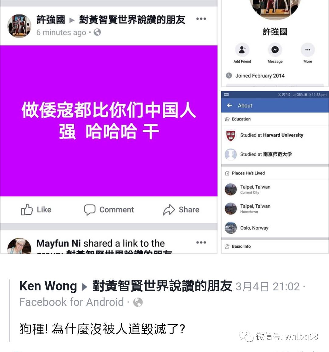 当然,我们并不能因为他有一个日本妹夫就说他有什么不对,但以他开口闭口用“支那”直称中国就不得不让人质疑,他许强国的民族认同问题。前天(4日),他在脸书上对坚定反对“台独”支持统一的台湾资深评论人黄智贤的支持者写道:“做倭寇都比你们中国人强”。