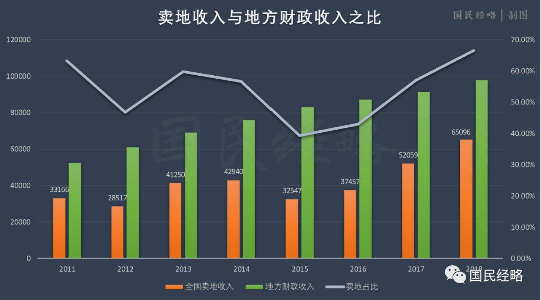 数据显示,2018年,全国土地使用权出让收入65096亿元,同比增长25%,创出新高。从2015年到2018年,卖地收入一年一个台阶。2015年是3.25万亿,2016年是3.75万亿,2017年是5.2万亿,2018年是6.5万亿。