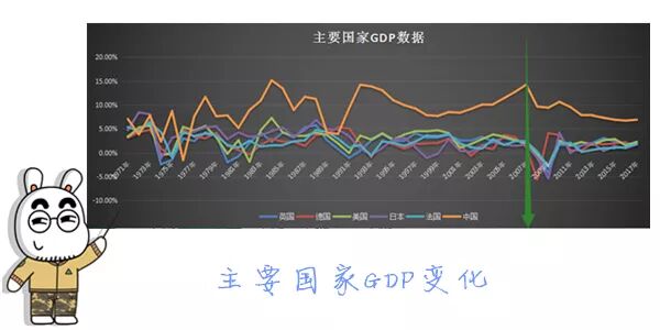 我们看GDP的增长数据可以发现,2008年之后,无论是发达国家,还是发展中国家,除了个别国家(例如德国),大家的增长平台都往下掉了。美国08年前还有4的时候,08年后掉到了3以下;英国基本上就是1-2了,法国则是0-1之间徘徊,中国则从10一路掉到7,再掉到6。