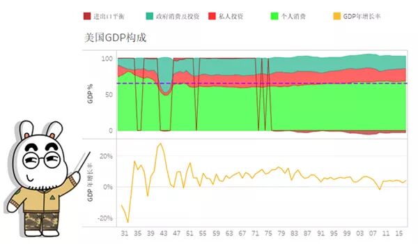 三驾马车的比例,体现了一个国家经济支柱分配情况和发达程度。以中国来说,17年消费占比58%多,而在2007年的时候,这个数字只有38%多一点。而美国从1927年开始直到2017年,除了个别时间外,消费占比都在60%以上。