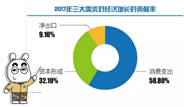 以中国来说,2017年GDP首次超过80万亿人民币(2018年超过了90万亿),其中消费占了58.8%;投资占32.1%;净出口占9.1%。