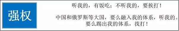 可以说,美国的全球化综合来看就是“强权”统治。顺从美国的国家,可以在为美国输送利益的基础上生存和发展,不顺从美国的国家,则会被美国打击甚至被颠覆政权。即便是中国和俄罗斯这样的大国,美国也要求必须听它的,才能融入它所设计的全球化体系,否则就会被踢出体系并且受到“攻击”。