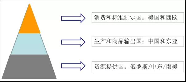 美国把世界经济体系分为三个层级:资源提供国、生产和商品输出国、消费和标准制定国(主要是美国)。