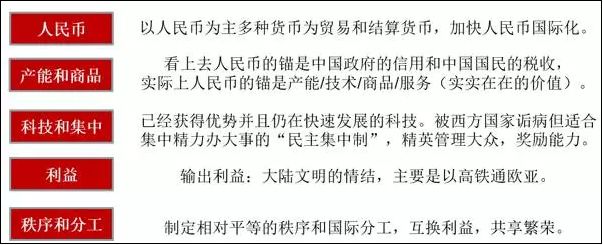 人民币将是中国主导设计的全球化体系中的主要结算货币,但我们并不排斥其他成员国的货币,比如卢布、欧元,我们甚至不排斥美元,一揽子货币都可以成为全球贸易的结算货币。