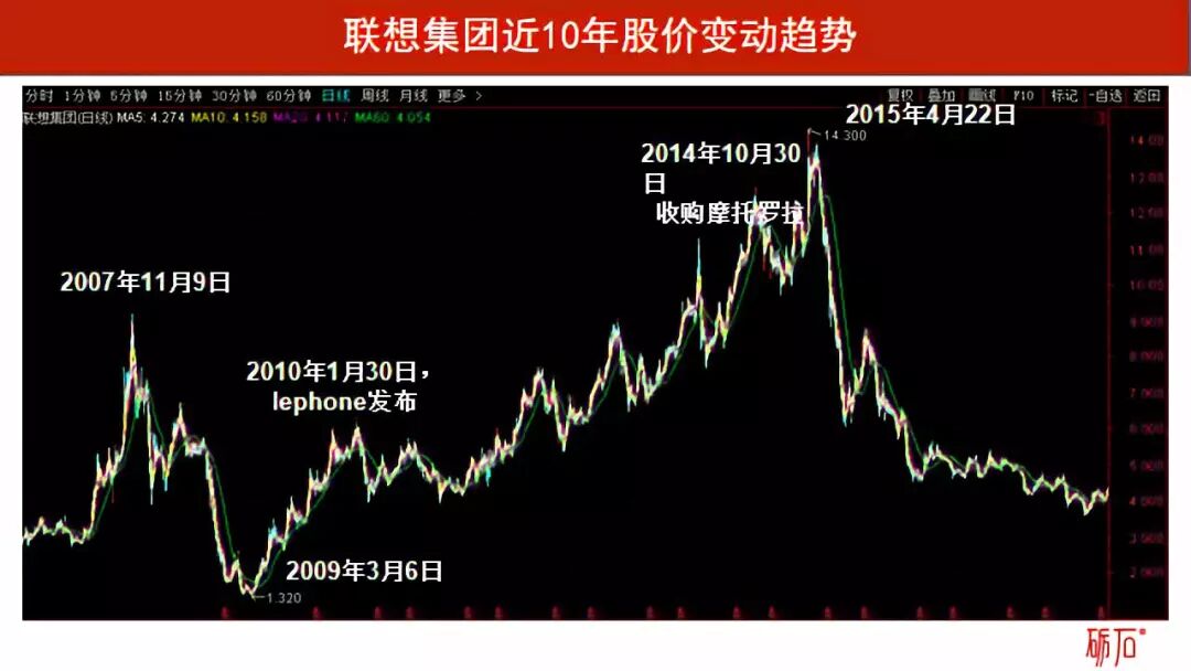 例如,联想集团于2010年发布第一代lephone手机,在进军智能手机业务后,联想集团的股价就持续增长,直到2014年10月收购摩托罗拉后,还有一段高速增长。但从2015年4月开始,一方面受宏观资本市场的影响,另外一方面最被投资者寄予厚望的智能手机业务出现下滑,导致联想集团的股价出现下滑。
