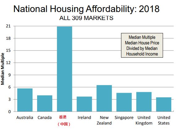 香港房价收入比(都是中位数)从2017年的19.4倍,上升到2018年的20.9倍。简单地说,就是一个中等收入家庭不吃不喝要20.9年才能买起一套普通住房,用这个报告形容就是房价已经到了“严重负担不起”的程度。