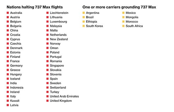 据彭博社3月13日最新梳理的数据,截至当天上午8时,至少已有43个国家(地区)全面停飞波音737 MAX机型,另外还有8个国家的1家或1家以上的航空公司暂停737 MAX系列的运营。对波音737 MAX发布禁飞令的国家(地区)包括:澳大利亚、奥地利、比利时、保加利亚、中国、克罗地亚、塞浦路斯、捷克、丹麦、爱沙尼亚、芬兰、法国、德国、希腊、匈牙利、冰岛、印度、印度尼西亚、爱尔兰、意大利、科威特、拉脱维亚、列支敦士登公国、立陶宛、卢森堡、马来西亚、马耳他、荷兰、新西兰、挪威、阿曼、波兰、葡萄牙、罗马尼亚、新加坡、斯洛伐克、斯洛文尼亚、西班牙、瑞典、瑞士、土耳其、阿拉伯联合酋长国、英国。