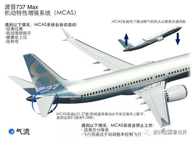 最终没有办法,波音设计师就开发了一套MCAS机动特性增强系统,随时监测飞机迎角,迎角超过了安全界限,就自动压低机头保持10秒钟飞行,然后解除。