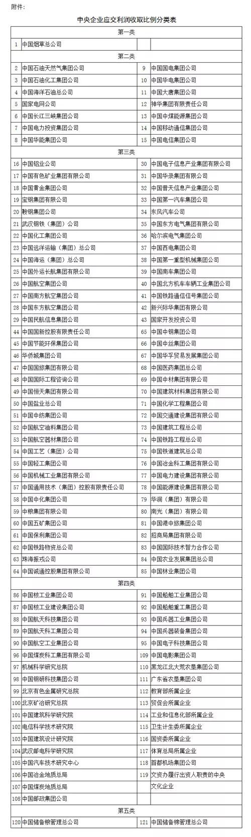 按照规定,央企上缴利润的比例分为五档: