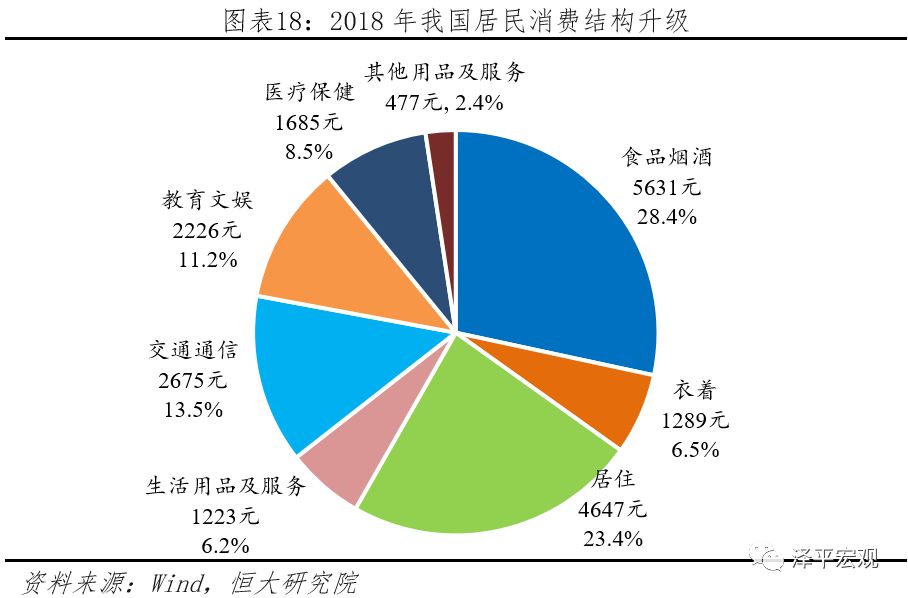 我国居民恩格尔系数不断降低,整体上消费结构升级。2018年食品烟酒支出占总支出比重为28.4%,较2017年下降0.9个百分点。根据联合国粮农组织提出的标准,恩格尔系数达到30%-40%为富裕水平,低于30%为最富裕水平,由此从消费结构指标看我国已连续两年保持在“最富裕”水平。同时,全国居民人均消费支出中,服务性消费占比为44.2%,比上年提高1.6个百分点,消费结构改善。