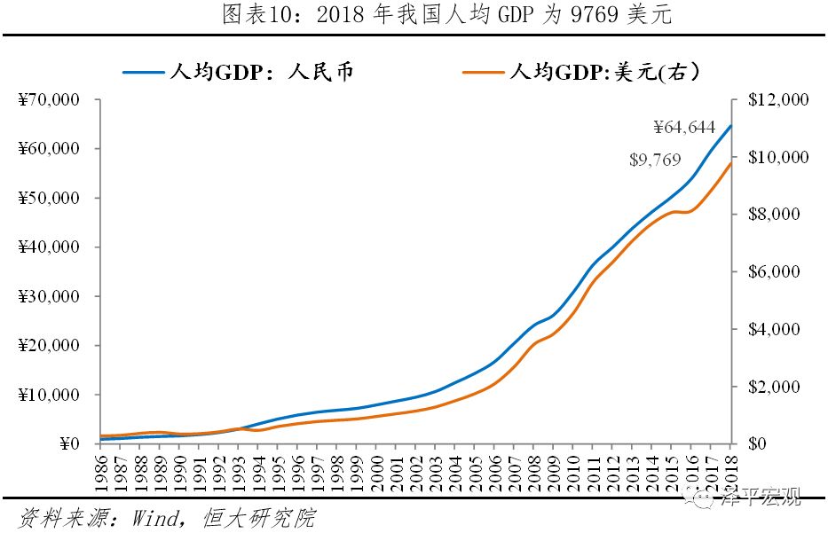 2018年中国人均GDP为64644元,名义增长9.2%,较上年增速放缓1.1个百分点。以美元计价,我国2018年人均GDP为9769美元。按世界银行标准,高收入经济体人均GDP门槛约为1.25万美元。如果中国能够转型成功,按照6%左右的速度再增长4年左右,大约在2022年前后中国将跨越中等收入陷阱、跨入高收入国家俱乐部。一个14亿人口的超大型经济体从起飞、转型、到跨越,这将是人类经济增长史上的奇迹。