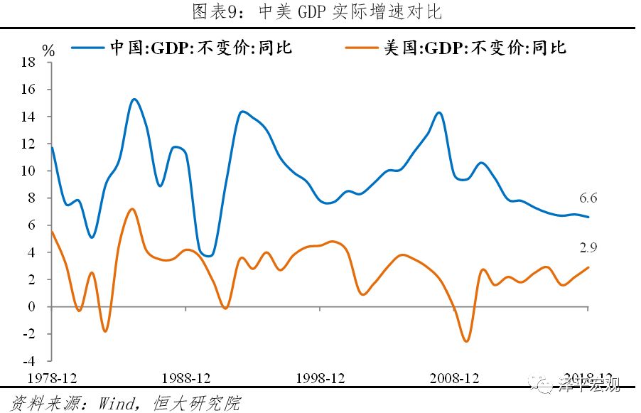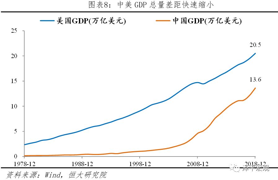 2018年中国GDP规模达90万亿元,相当于13.6万亿美元,为世界第二大经济体。美国2018年GDP为20.5万亿美元,中国GDP相当于美国的约66%,中美差距正在快速缩小。2018年中国GDP实际增速6.6%,低于1978-2008年高速增长期的平均增速9.8%,但仍远高于美国2018年预计增速的2.9%。据IMF估计,2018年全球GDP总量达84.8万亿美元,其中,中国和美国占全球GDP比重分别为16.1%和24.2%,第三大经济体日本占全球GDP比重仅5.9%,中美主导全球。
