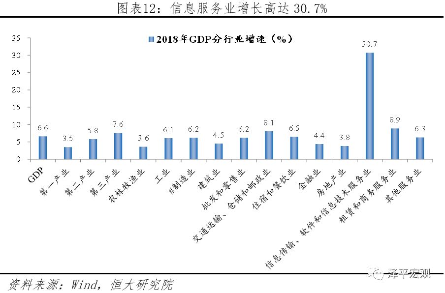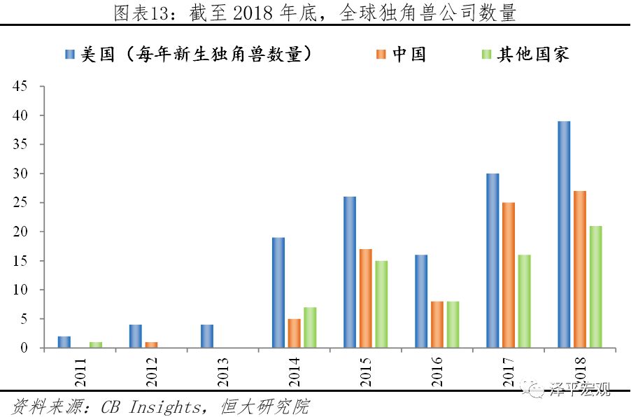 中国新经济具有旺盛活力,跨界创新蓬勃发展。2018年,信息服务业一枝独秀,同比增速高达30.7%。全年软件和信息技术服务业完成软件业务收入63061亿元,按可比口径计算,比上年增长14.2%。从子行业来看,移动游戏、网络购物约车平台、旅游平台、大数据云计算等众多子行业增速达30%-50%。每个子行业都诞生了一批独角兽企业,使得中国企业在全球创新创业领域的话语权迅速提升。截至2018年底,中美独角兽分别占全球比重为28%和48%。未来信息服务业与人工智能、AR、VR技术结合仍将释放巨大的增长潜力,为中国经济发展提供重要动能。