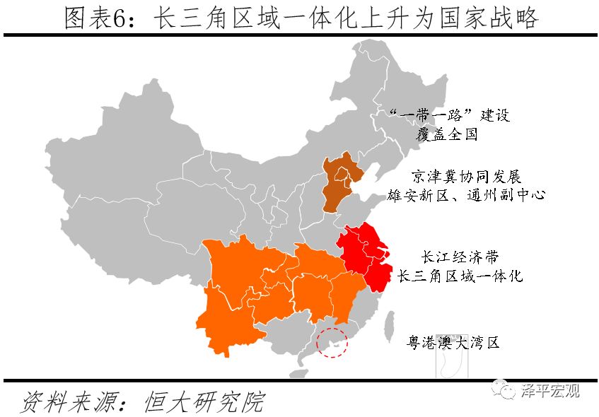 长三角区域一体化上升为国家战略。十九大报告、“十三五”规划均明确,当前中国区域发展总体战略为西部开发、东北振兴、中部崛起、东部率先发展,其中以“一带一路”建设、京津冀协同发展、长江经济带发展、粤港澳大湾区建设等重大战略为引领。2018年11月,习近平总书记在首届中国国际进口博览会开幕式发表演讲时提到,将支持长江三角洲区域一体化发展并上升为国家战略,着力落实新发展理念,构建现代化经济体系,推进更高起点的深化改革和更高层次的对外开放。作为中国最发达的地区之一,长三角地区(3省1市)GDP合计占全国的24%,常住人口占16%。在上述背景下,本次政府工作报告将从属于长江经济带的长三角区域单独提出上升为国家战略,并强调推进区域一体化。