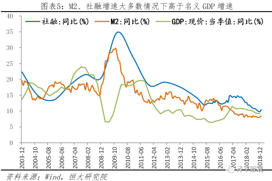 相比2018年,2019年货币政策不提“中性”,预计2019年M2与社融增速将平稳反弹。今年政府工作报告延续中央经济工作会议和四季度货币政策执行报告“稳中求进”总基调,更注重“稳健”、“松紧适度”,不提“保持中性”。在货币政策边际放松的背景下,要求M2及社融增速与名义GDP增速相匹配。根据财政赤字率2.8%及2.76万亿赤字规模,可大致推算出2019年名义GDP增速为9.5%。我们认为2019年M2和社融增速在10%左右可能较为合理,预计2019年M2和社融有望延续1月反弹态势。从力度看,2018年M2和社融同比增速为8.1%和9.8%,因此2019年不是大水漫灌。