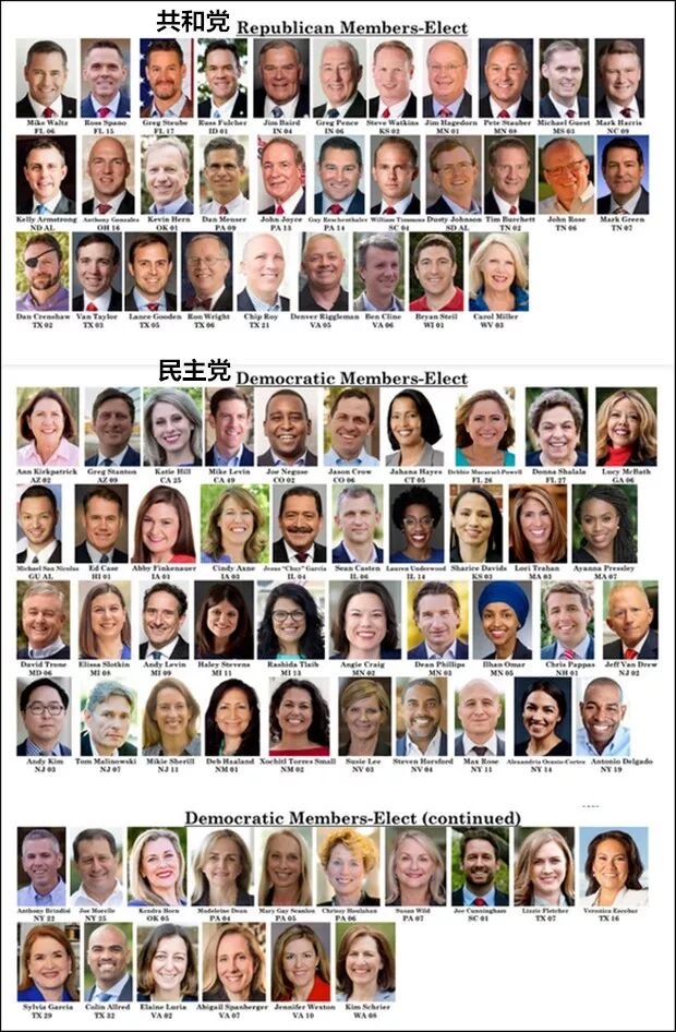 我们来看看去年美国中期选举后共和党和民主的议员,明显的看出来:共和党主要是白人,而且大多是男人,一看就是“保守派”;民主党各种肤色都有,而且女性比例很高,一看就是“改革派”。