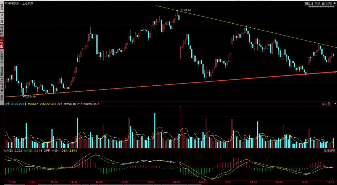 还有一个可能则是跌破自上证指数突破2900点以来,以2920为低点的一根上升趋势线。如果确认跌破这根上升趋势线,我会继续考虑轻仓甚至空仓等待行情企稳后再介入。