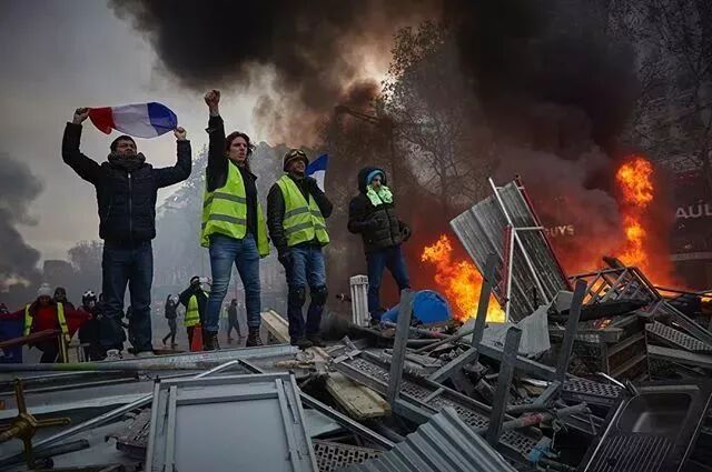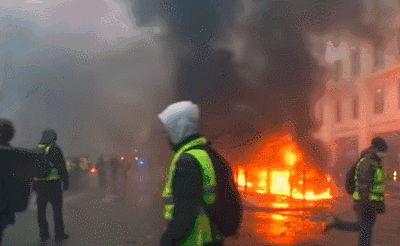后来,抗议逐渐变成大规模骚乱,夹杂着严重的暴力,人群冲向巴黎著名的香榭丽舍大街,焚烧汽车、打砸商店、玻璃橱窗、破坏古迹,甚至有“黄马甲”冲入私宅,放火……警方组成人墙,释放催泪瓦斯、高压水枪。“黄马甲”运动的烽火,迅速燃遍整个法国。