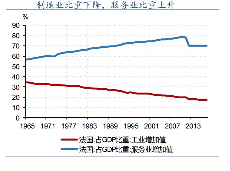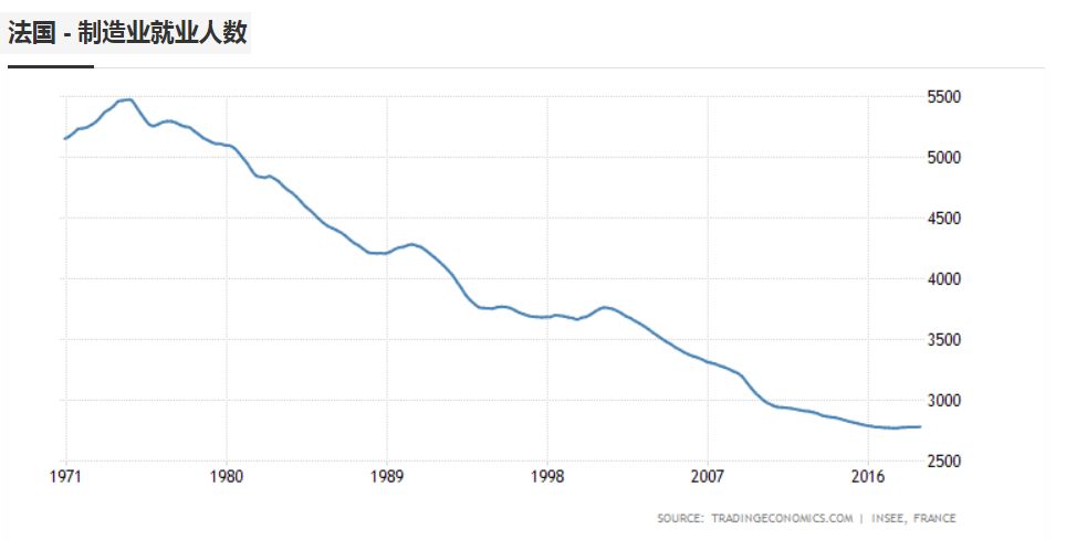 反映在数据上,最突出的表现就是,法国的工业增加值上世纪60年代,在GDP中的比重超过35%,现在已经降至20%以下。