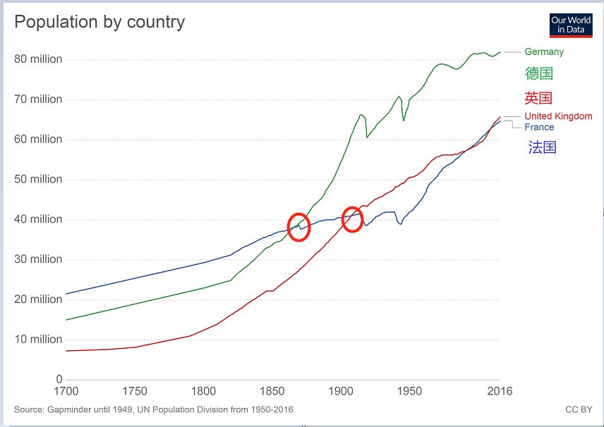 但在1866年,德国人口第一次超过法国之后,1909年英国人口规模又超过法国。