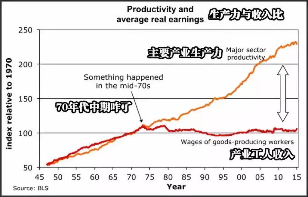 事实上,我们以前也给大家分析过,特朗普说的话是事实:从1974年以后美国的GDP一直在增长,但是产业工人工资40多年没有任何的增加,而物价却已经涨了无数倍——物价平均涨了2倍,但是教育费用涨了5倍、医疗涨了3倍左右。