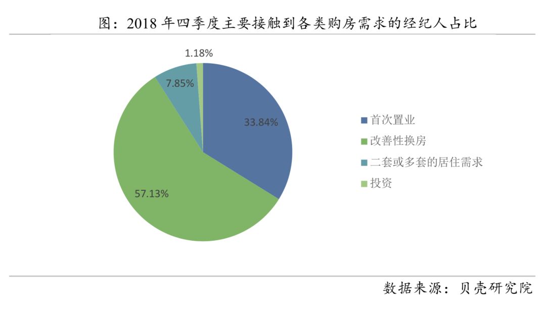 贝壳数据也佐证了这个推论。2018年四季度,北京主要接触到投资性需求占比的经纪人仅为1.2%。在政策严厉、市场低温的情况下,二手房市场交易主要由自住需求支撑。