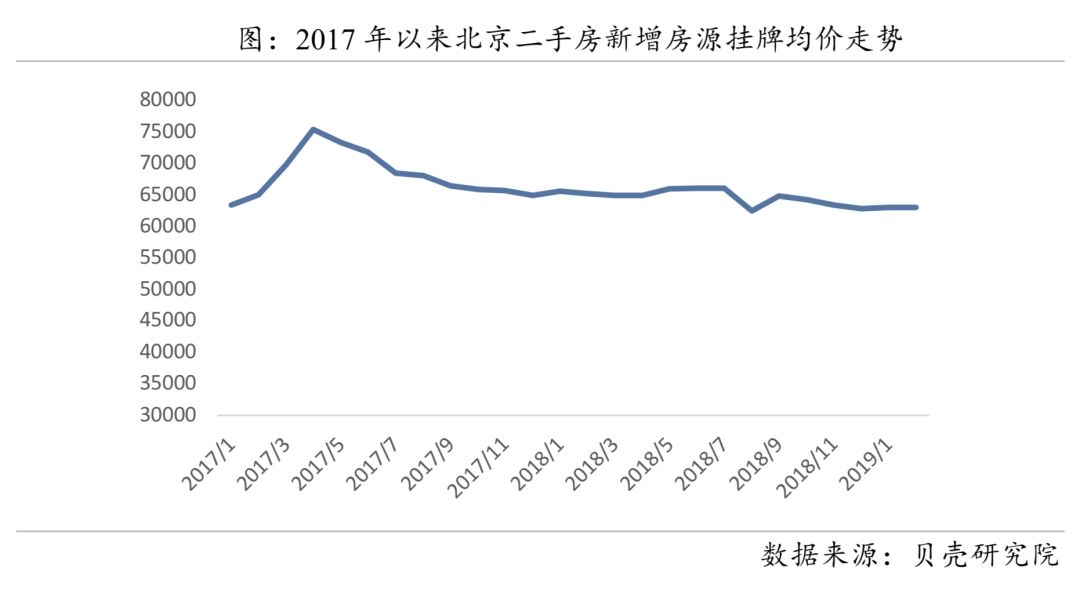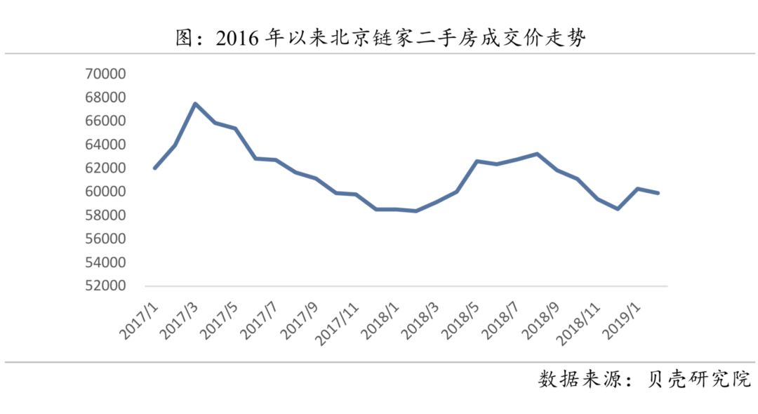 进入2019年后,房价修复反弹,回暖动力强劲。2019年2月北京二手房均价为59898元/平米,和2017年3月最高点对比,2年时间,共计下跌了11.3%。