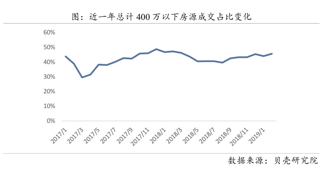 从总价段来看,400万总价的房源成交占比在调控后明显提升,2月份的交易比例达到45.6%。低总价的房源是市场上流通率最大的资产,这个毋庸置疑。