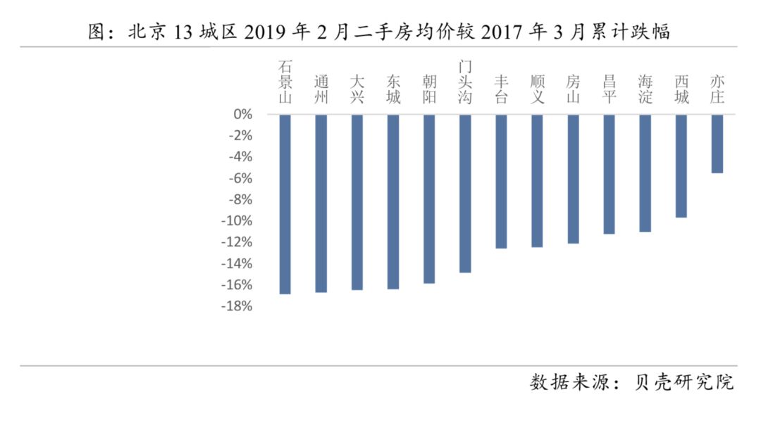 跌幅最大的三个区域,石景山、通州和大兴,都是在上轮周期中被过分炒作的区域,其中通州的概念是北京副中心,大兴的概念是新机场,石景山的概念是“还没涨起来的价值洼地”。